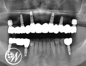 ・上顎:抜歯と同時にインプラント6本を埋入し、フルアーチの固定式で回復