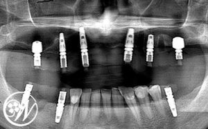 上顎は抜歯と同時にインプラントを6本埋入し、当日に固定式の仮歯(スクリュー固定)まで装着しました。